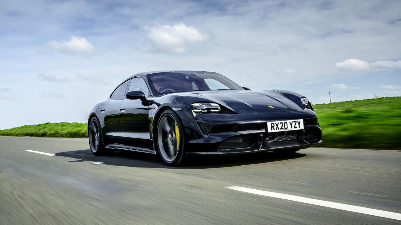 Wallpaper 2020 black Porsche Taycan Turbo S at speed