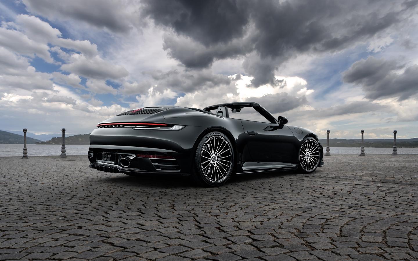 Wallpaper 2020 black Porsche 911 Carrera 4S Cabriolet under a stormy sky.