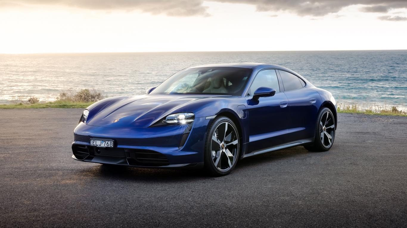 Wallpaper Blue Porsche Taycan Turbo car by the sea
