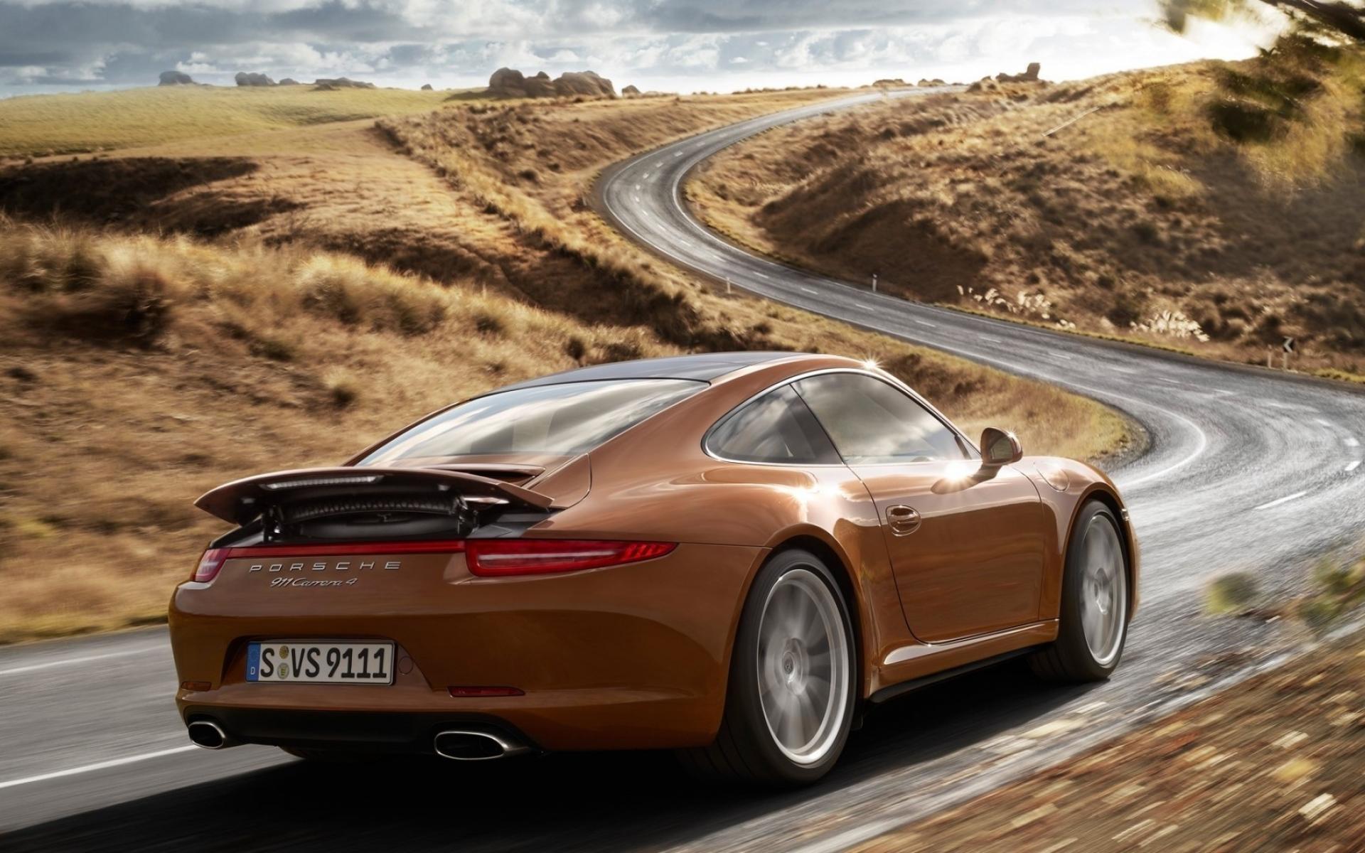 Wallpaper Brown Porsche on the highway outside the city