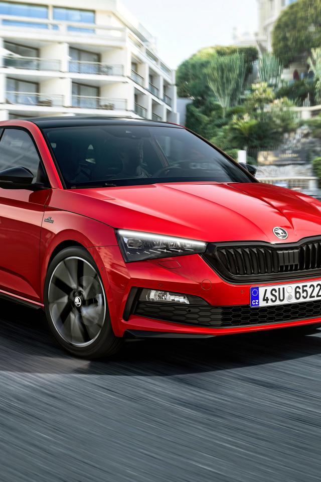 Wallpaper Red car Skoda Scala Monte Carlo 2019 on the road