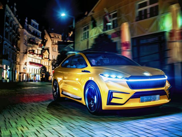 Wallpaper 2019 yellow Skoda Vision IV car on a city street