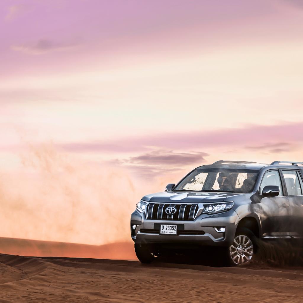 Wallpaper Silver SUV Toyota Land Cruiser Prado, 2018 rides the sand