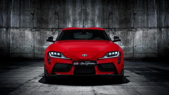 Wallpaper Red 2019 Toyota GR Supra car against a gray wall