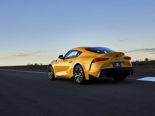 Wallpaper Yellow car Toyota GR Supra, 2021 on the track rear view