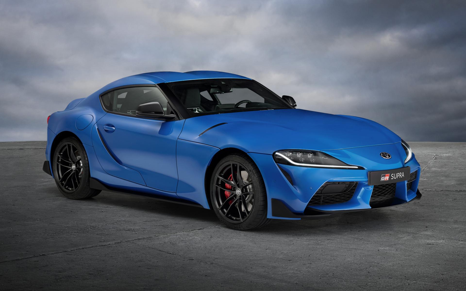 Wallpaper Blue car Toyota GR Supra, 2021 on a gray background