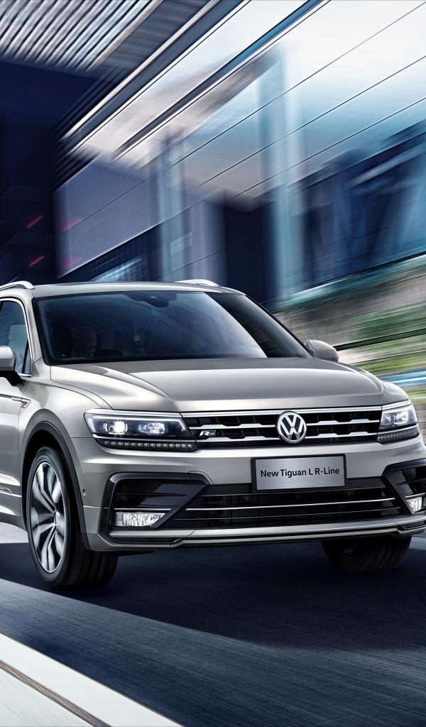 Wallpaper Silver car 2018 Volkswagen Tiguan L R-Line on a city street