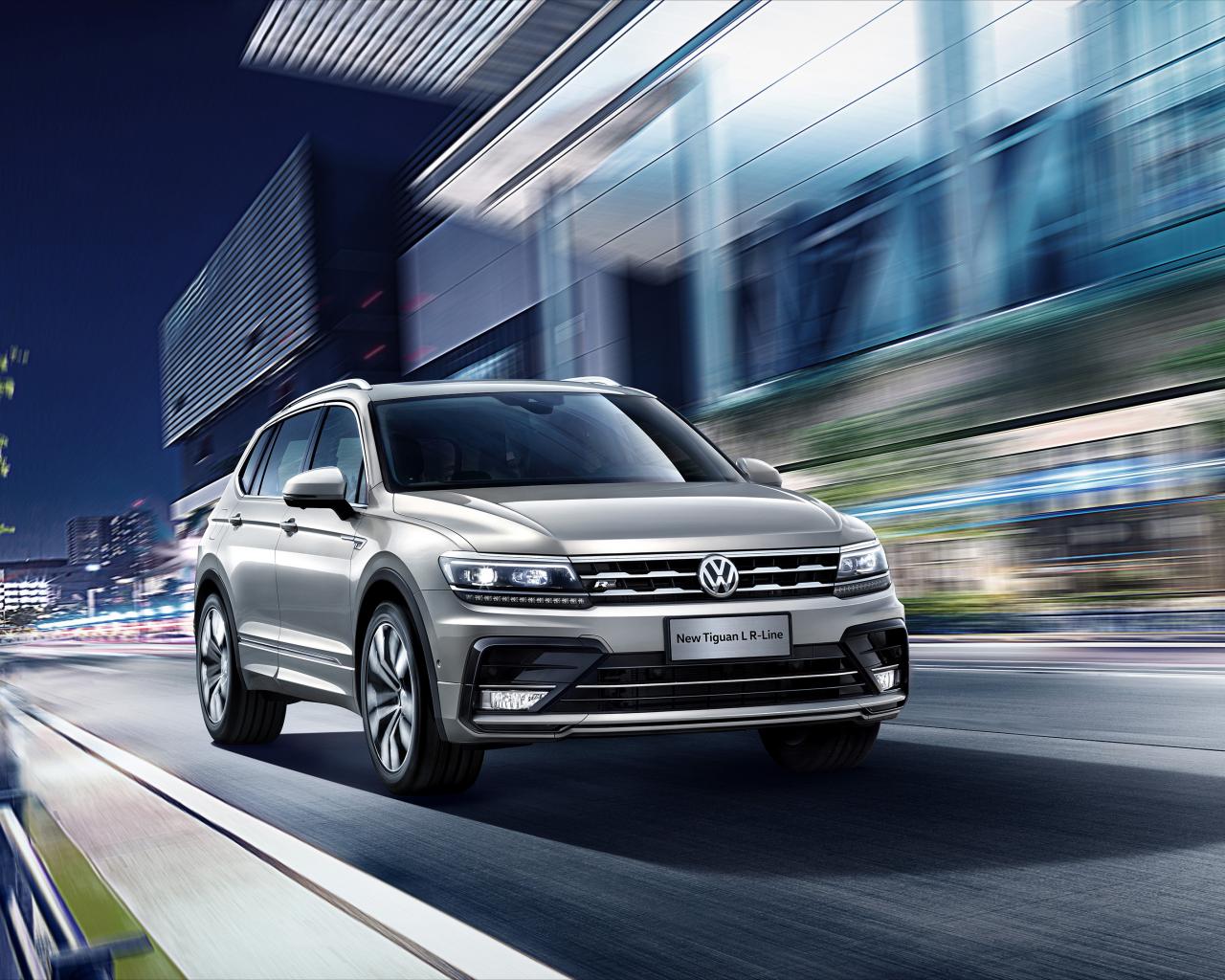 Wallpaper Silver car 2018 Volkswagen Tiguan L R-Line on a city street