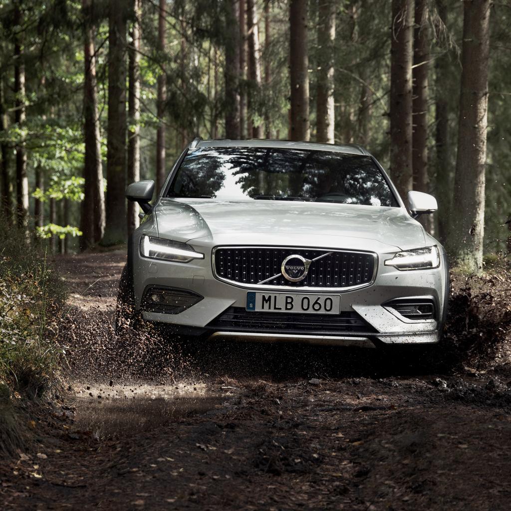 Wallpaper Silver car Volvo V60 T5 goes on a muddy forest road