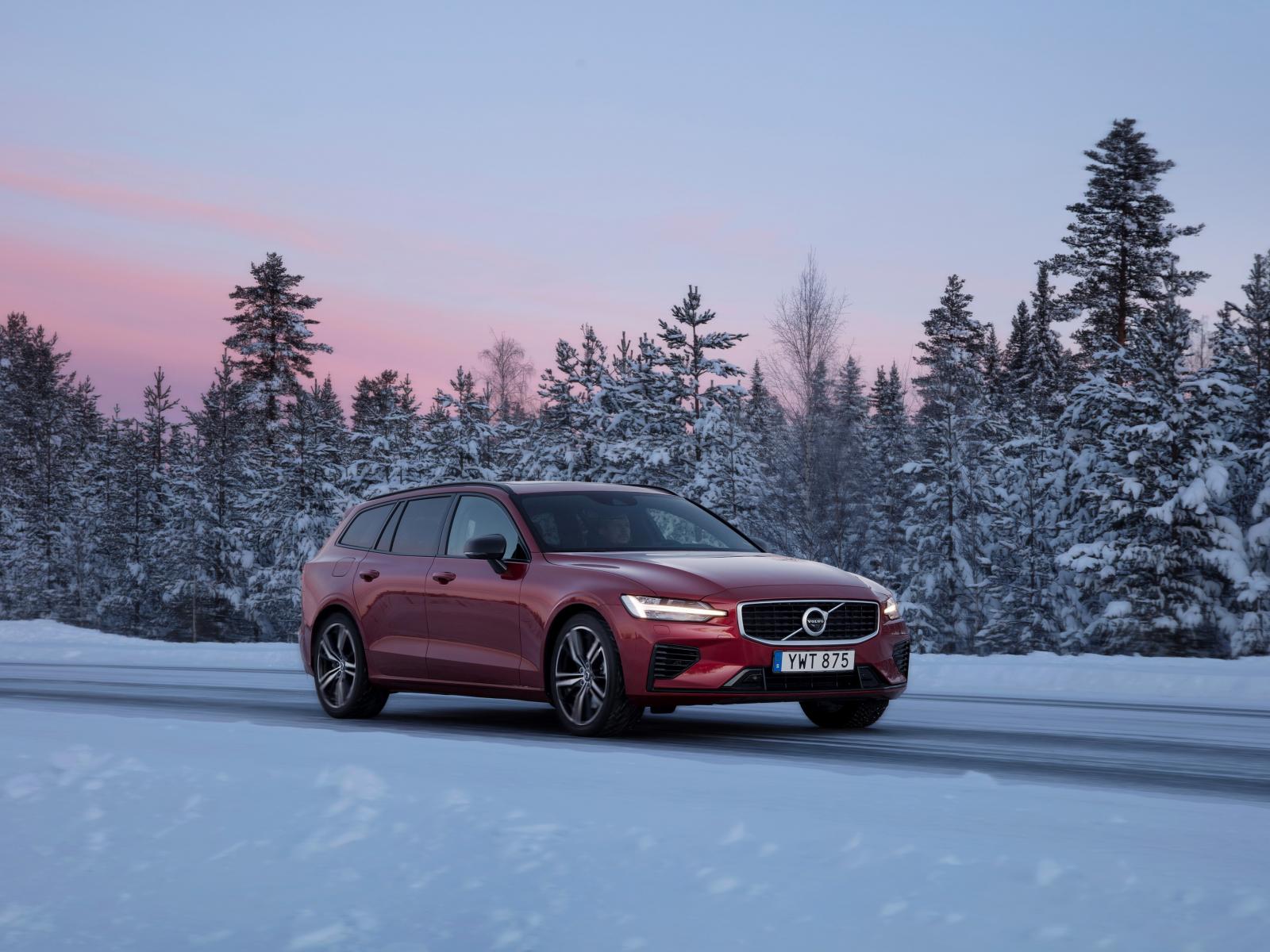 Wallpaper Red Volvo V60 car on a winter road