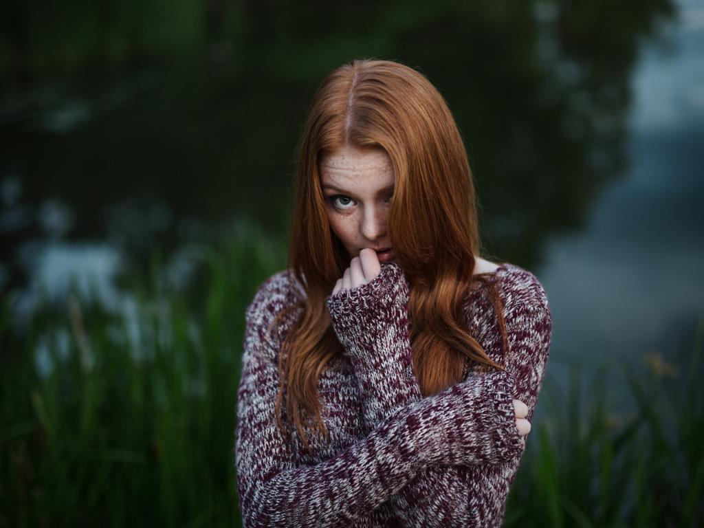 Wallpaper Red-haired girl in a sweater against the backdrop of the pond