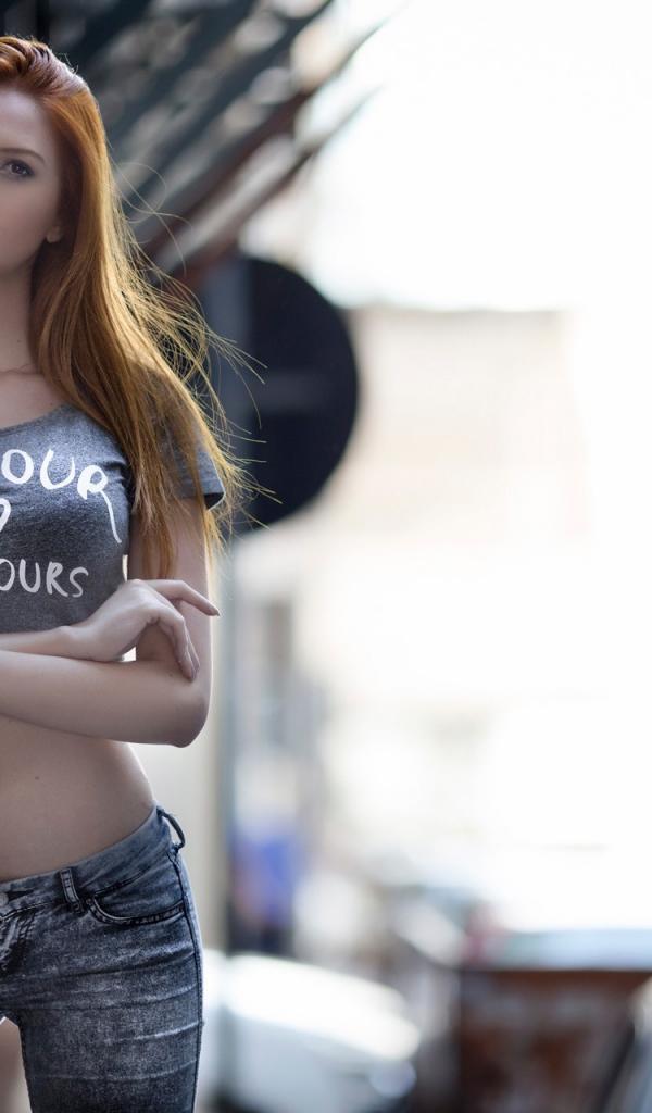 Wallpaper Red-haired girl in jeans with an inscription on the topic