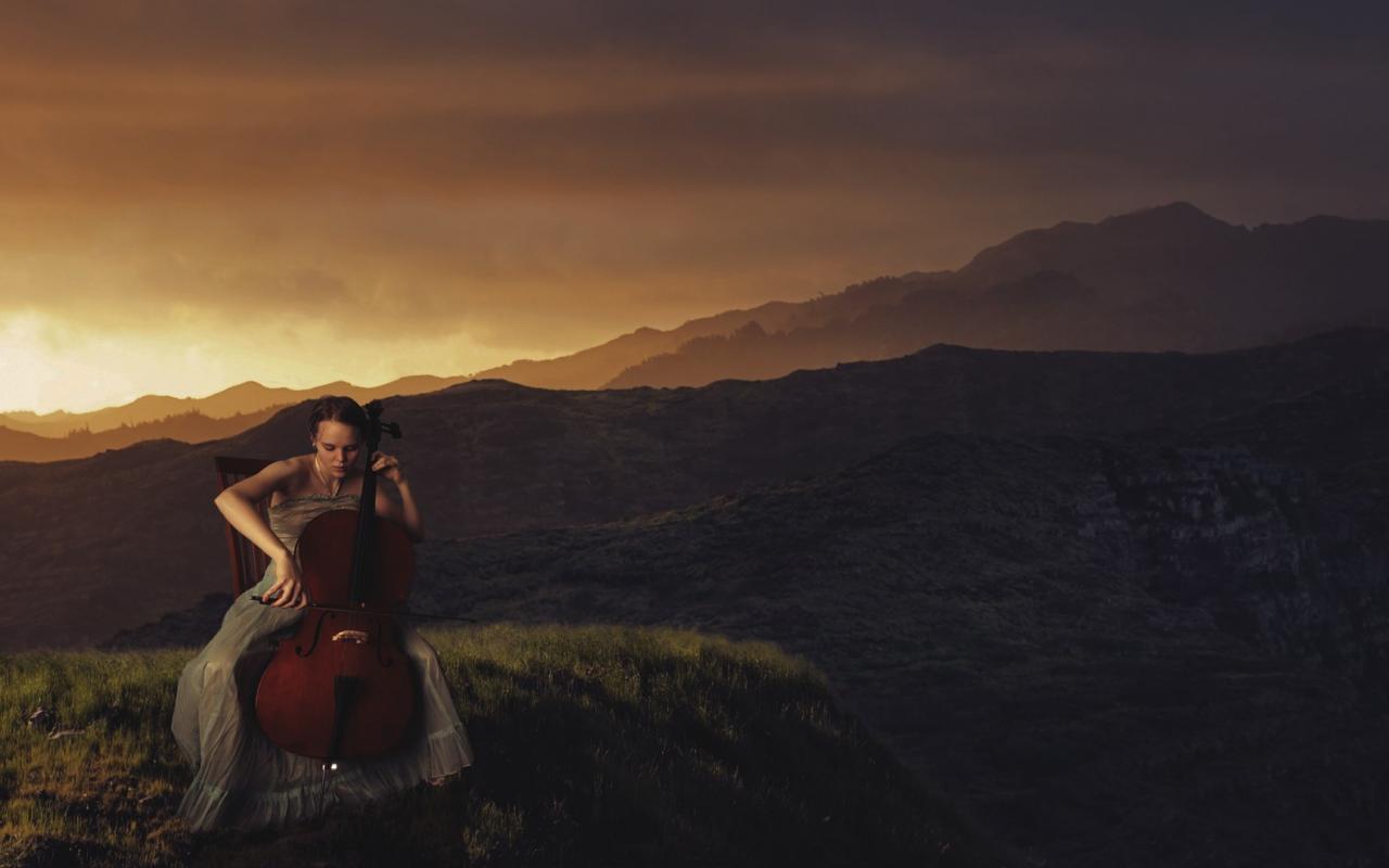 Wallpaper She plays the cello in the background of the mountains
