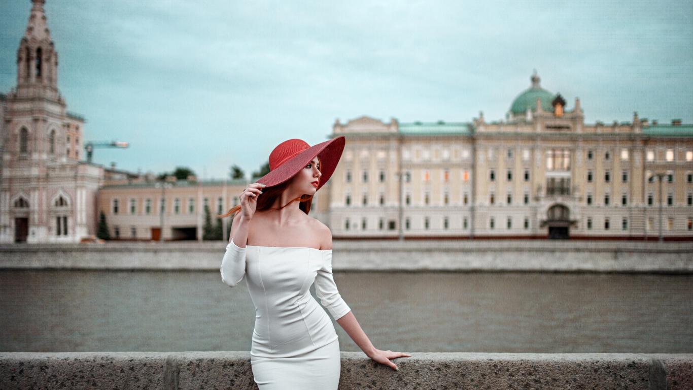 Wallpaper The girl in a white dress and red hat on the waterfront