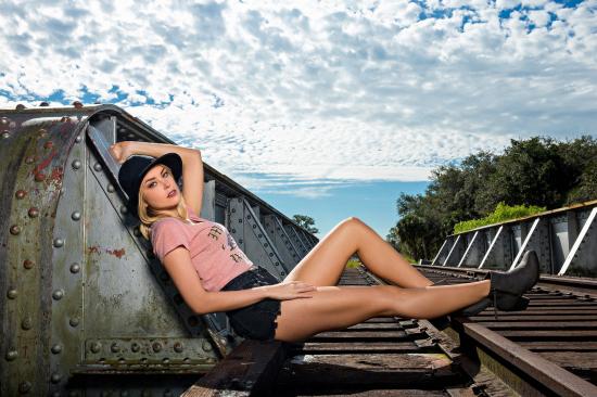 Wallpaper The blonde in a hat posing on the railway
