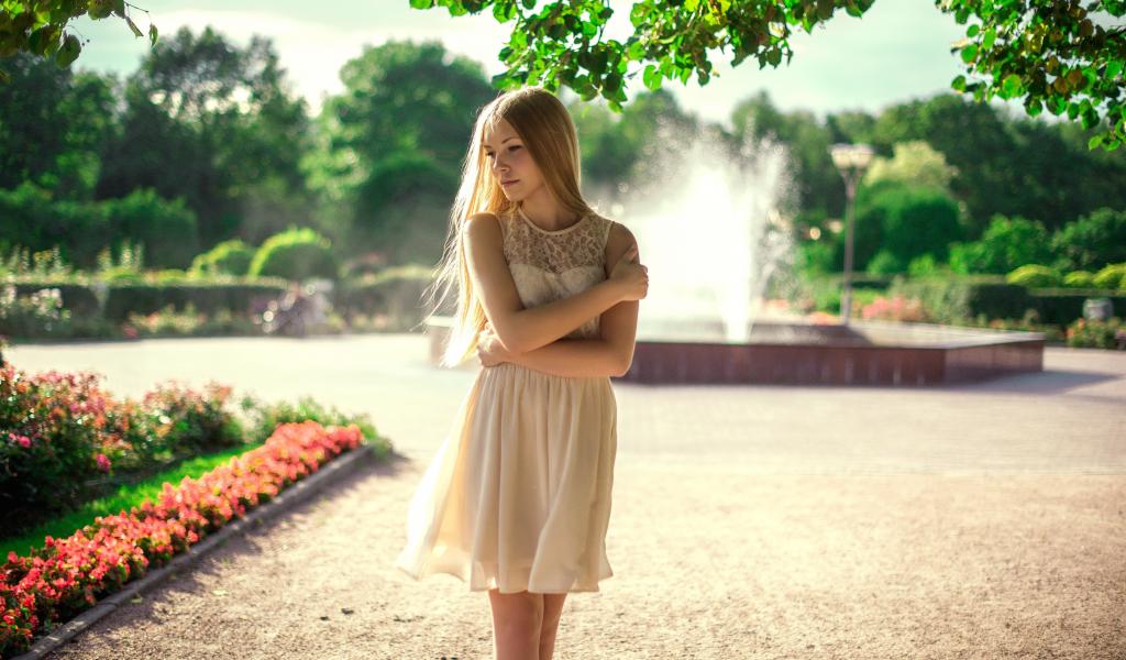 Wallpaper The blonde in the park against the backdrop of the fountain