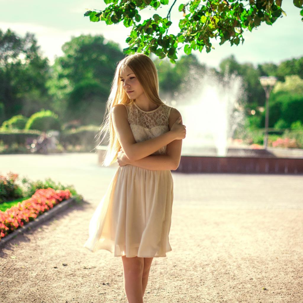 Wallpaper The blonde in the park against the backdrop of the fountain