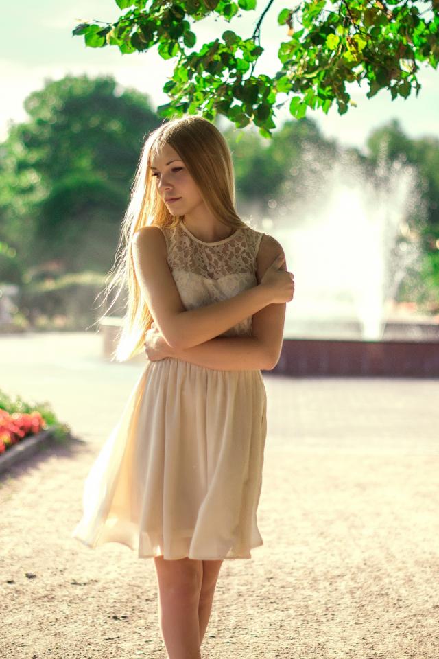 Wallpaper The blonde in the park against the backdrop of the fountain