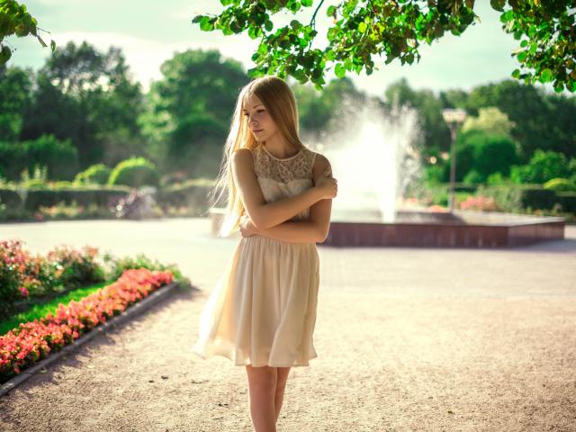 Wallpaper The blonde in the park against the backdrop of the fountain