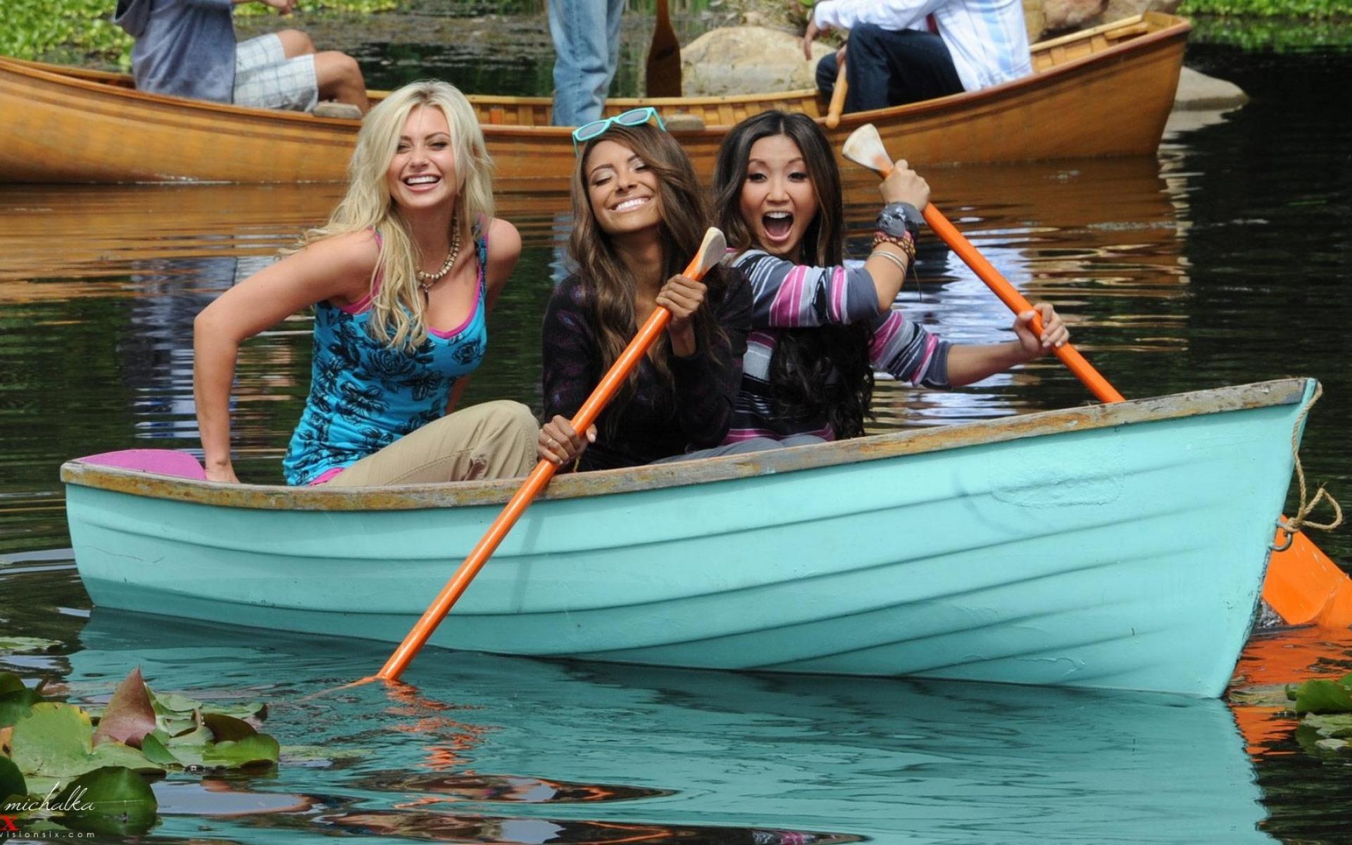Wallpaper Three girls in a blue boat