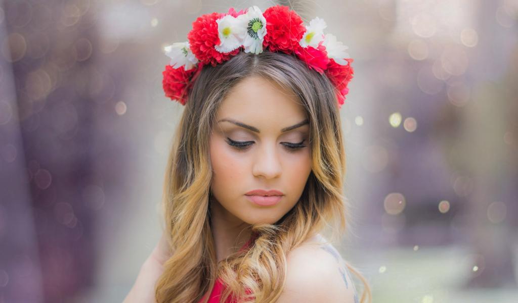 Wallpaper The wreath of red and white flowers on the head of the girl