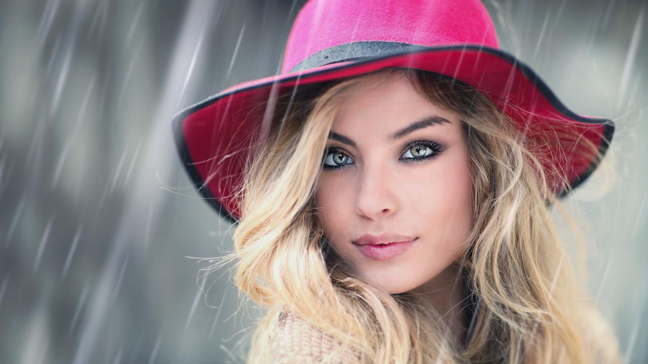 Wallpaper The blonde in a pink hat in the rain