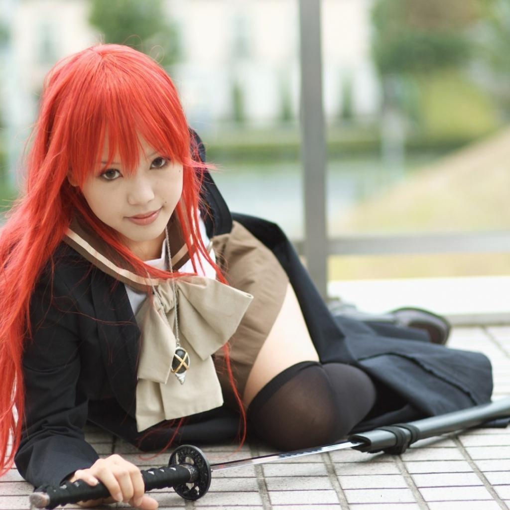 Wallpaper Red-haired Japanese girl pulls out a katana from its sheath