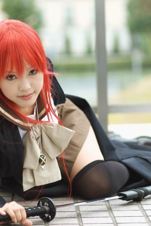 Wallpaper Red-haired Japanese girl pulls out a katana from its sheath