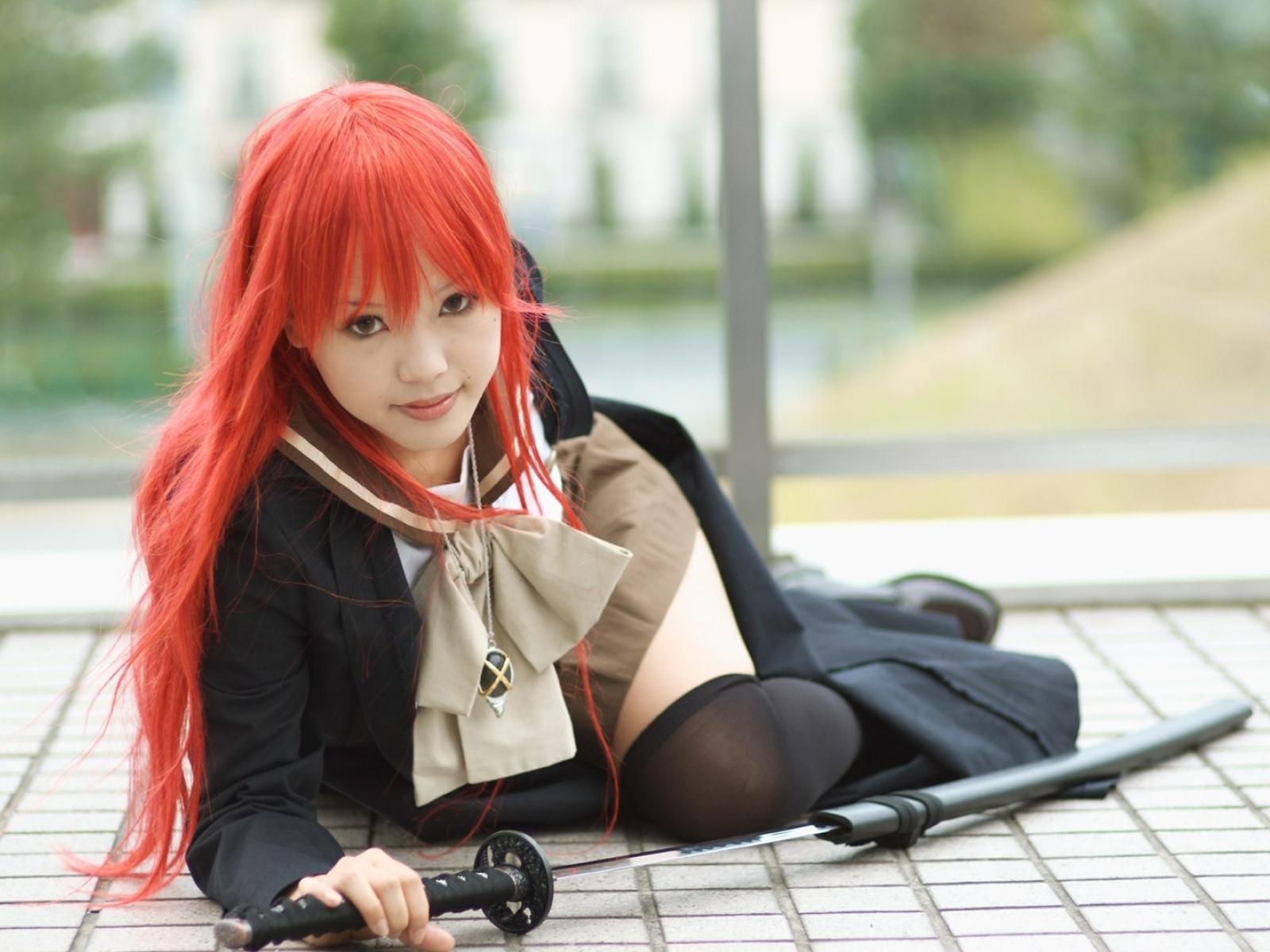 Wallpaper Red-haired Japanese girl pulls out a katana from its sheath
