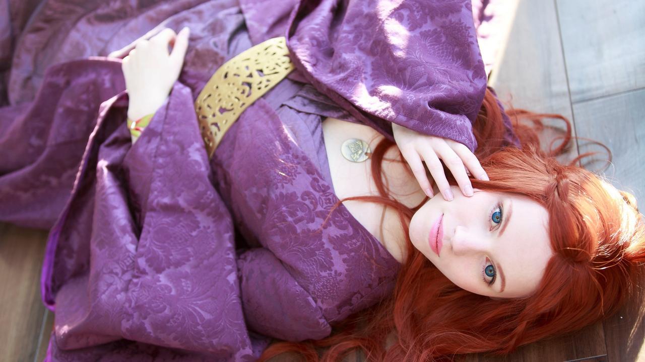 Wallpaper Red-haired girl in a lavender kimono lies on the floor