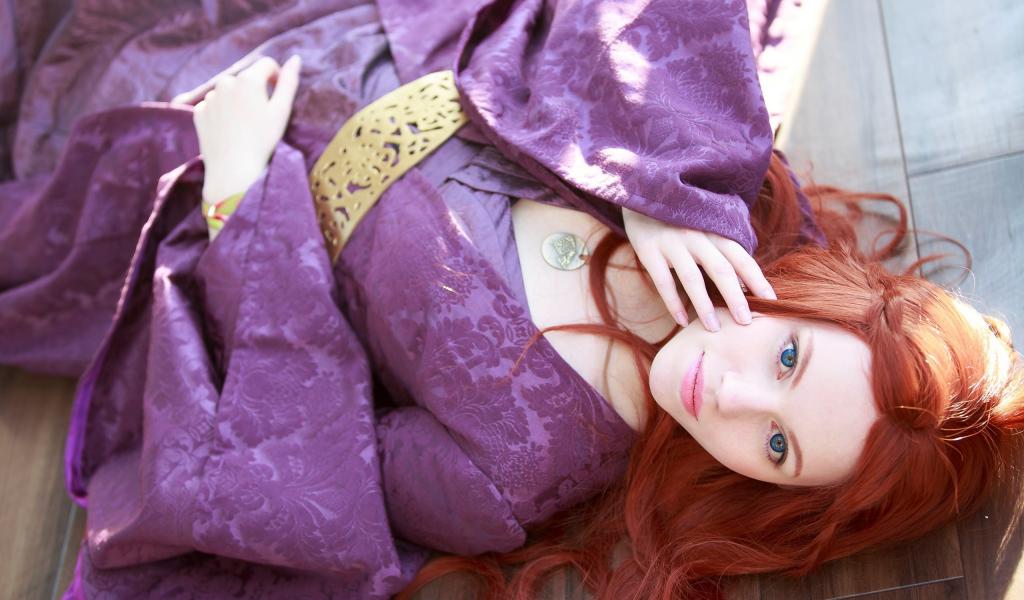 Wallpaper Red-haired girl in a lavender kimono lies on the floor