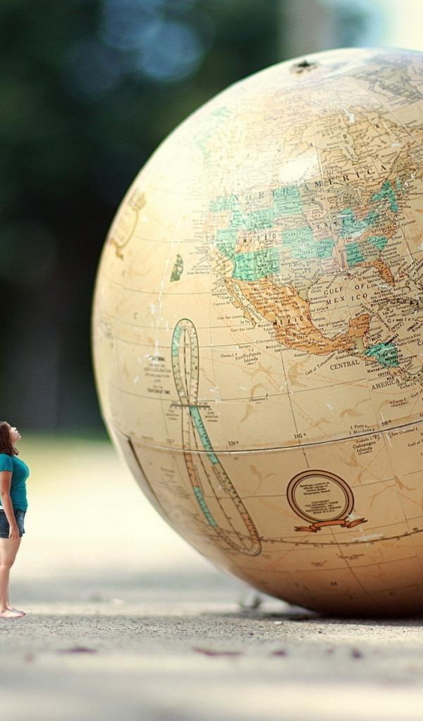 Wallpaper A girl stands in front of a huge globe