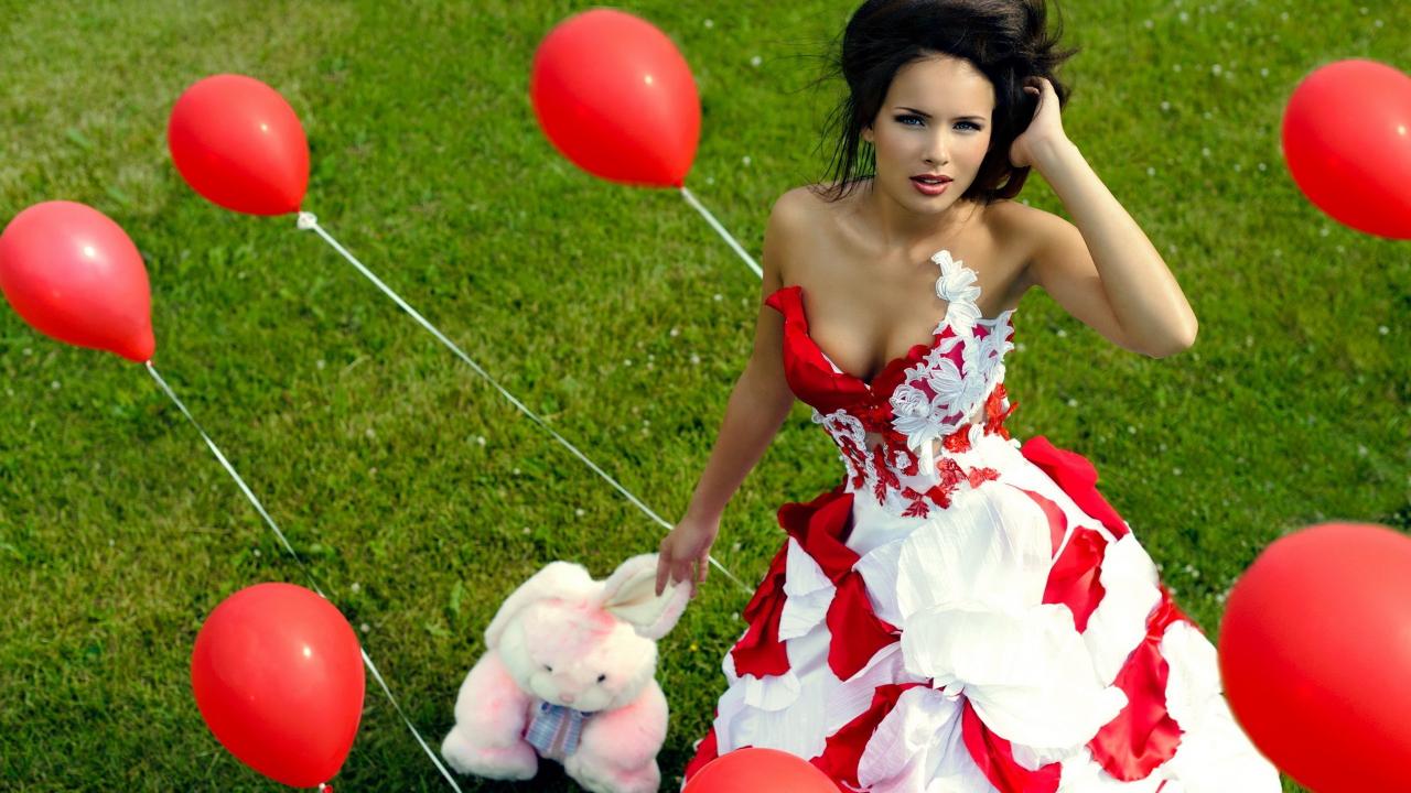Wallpaper The girl with a toy among red balloons