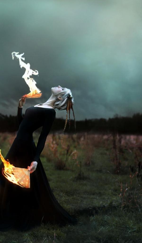 Wallpaper Girl in black dress playing with fire
