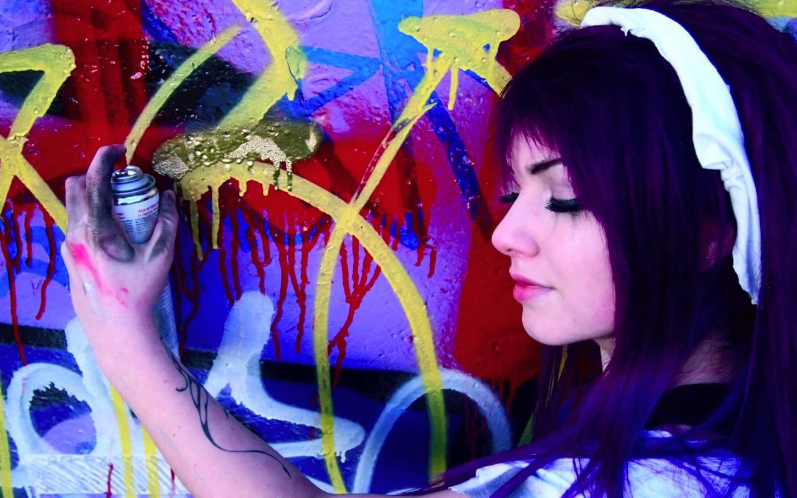 Wallpaper Girl painting graffiti on a wall