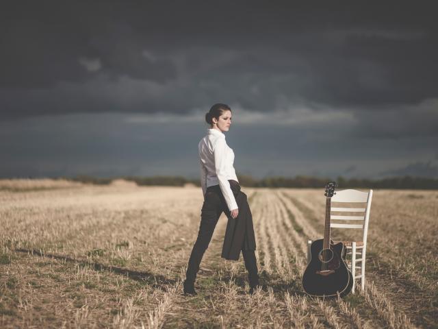 Wallpaper A girl in a field near his chair with a guitar