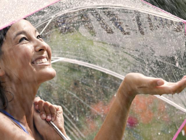 Wallpaper Girl under a transparent umbrella catches rain hand