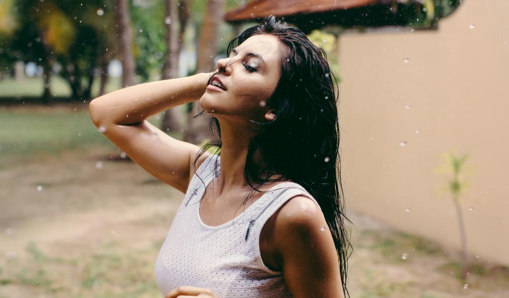 Wallpaper Brunette substitutes face under the rain