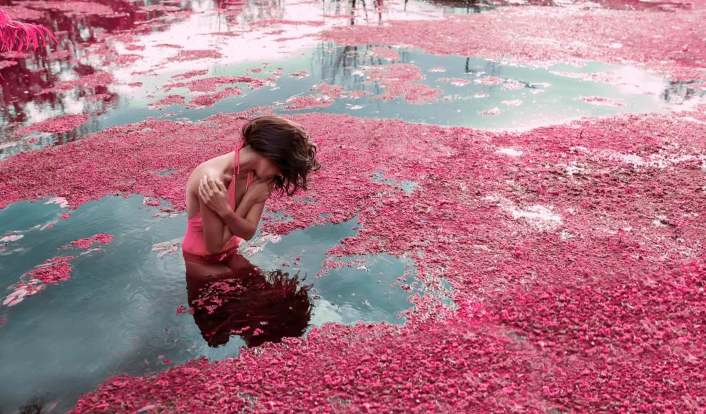 Wallpaper A girl stands in the water amongst rose petals