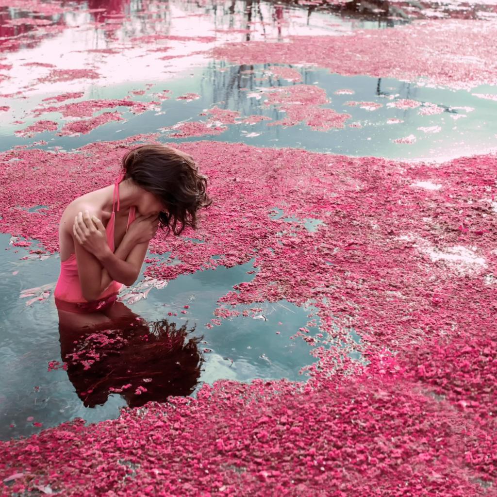 Wallpaper A girl stands in the water amongst rose petals