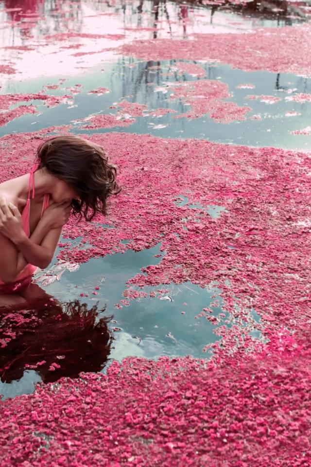 Wallpaper A girl stands in the water amongst rose petals
