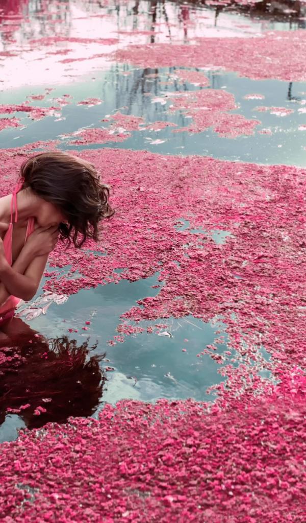Wallpaper A girl stands in the water amongst rose petals