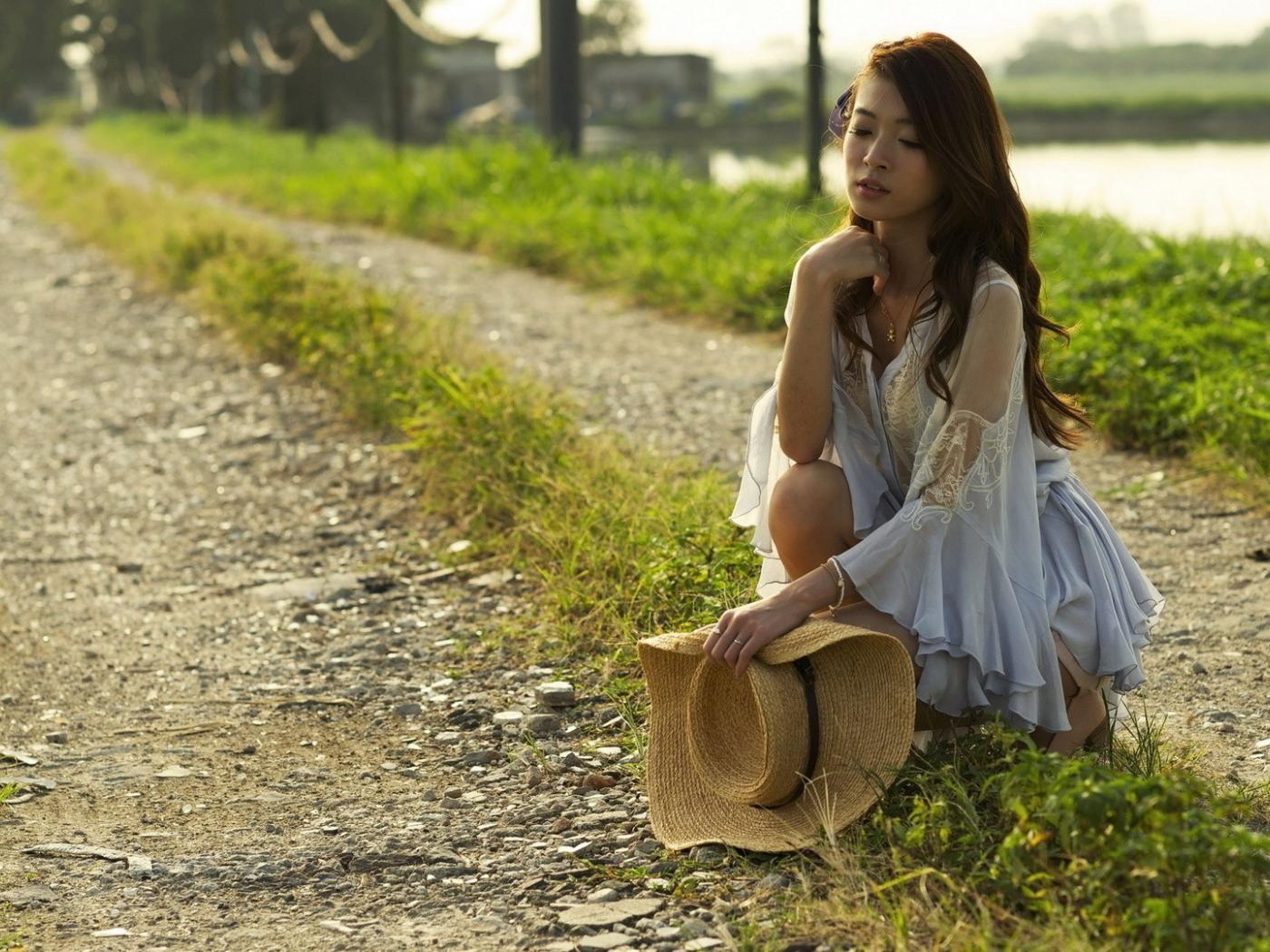 Wallpaper Girl with a hat sat on the road