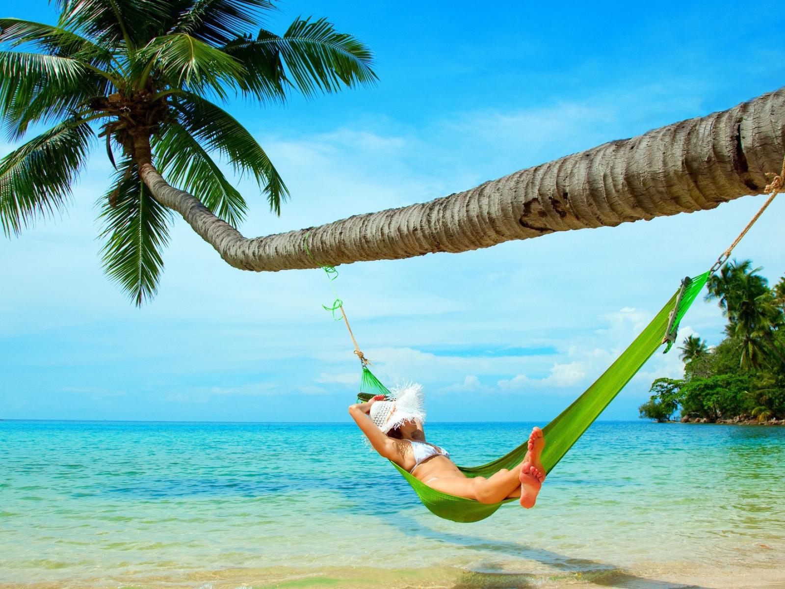Wallpaper Girl in green hammock under a palm tree