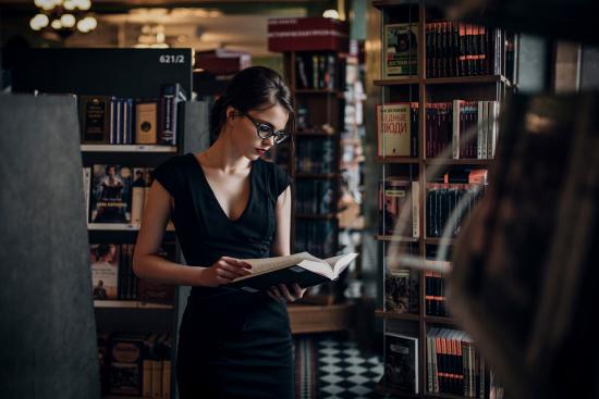 Wallpaper Girl reading among bookshelves