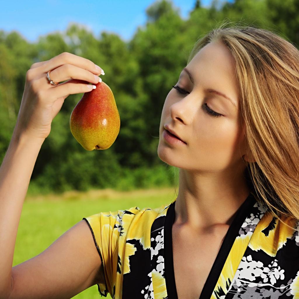 Wallpaper The girl looks at a pear