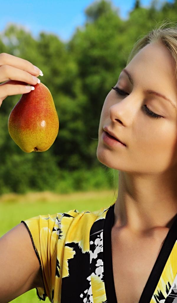 » Wallpaper The girl looks at a pear