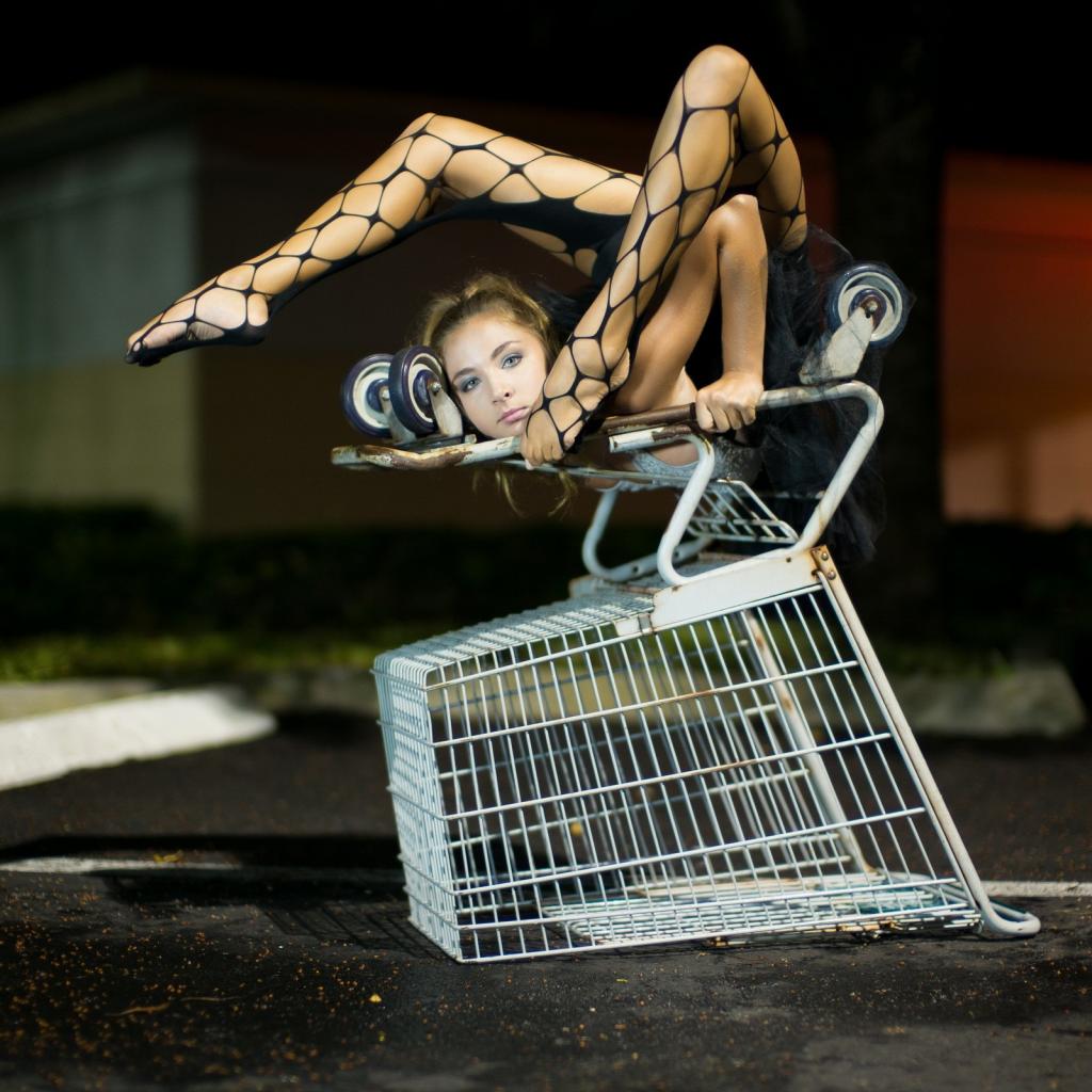 Wallpaper The girl is engaged in yoga on a basket from the supermarket