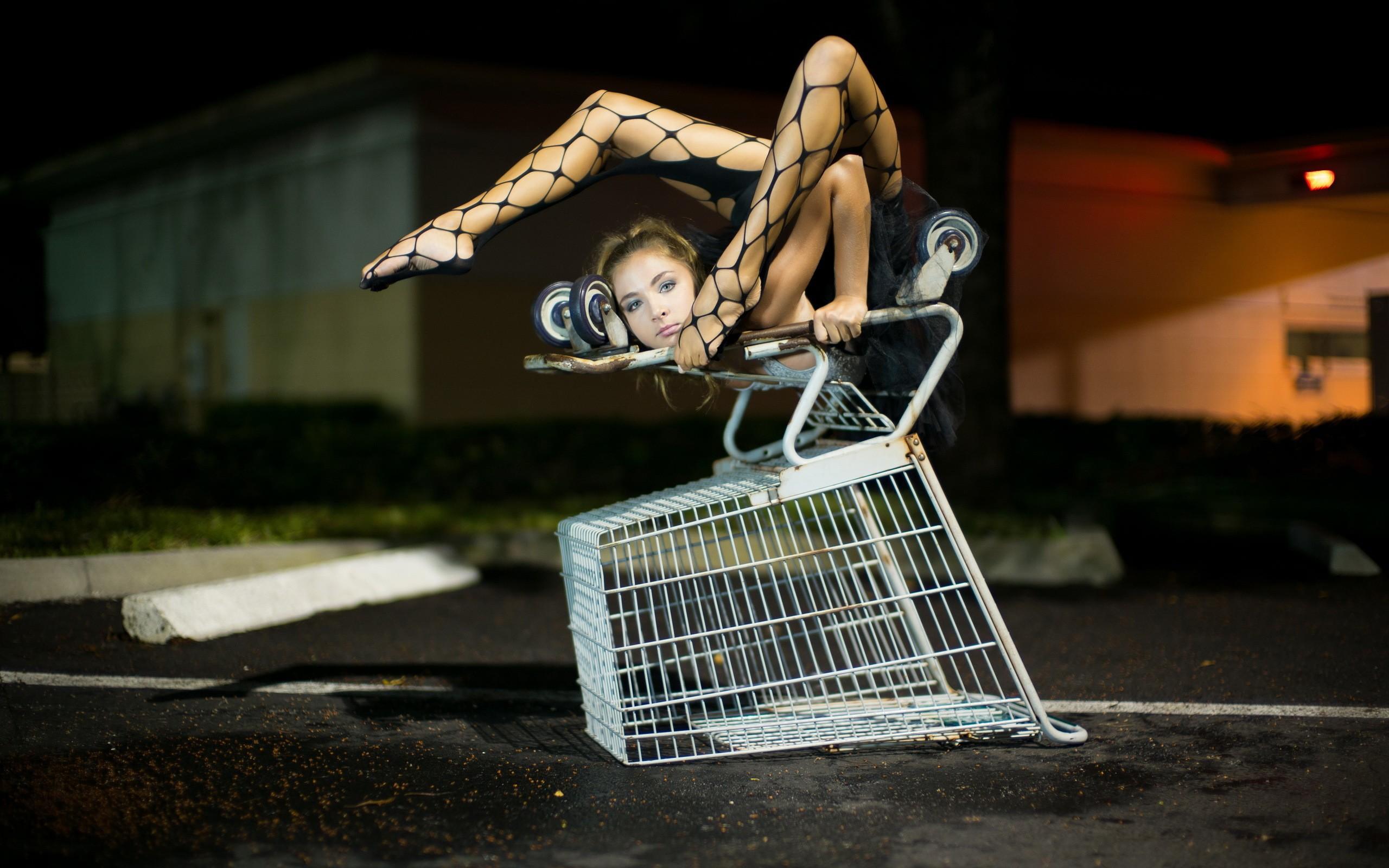 Wallpaper The girl is engaged in yoga on a basket from the supermarket