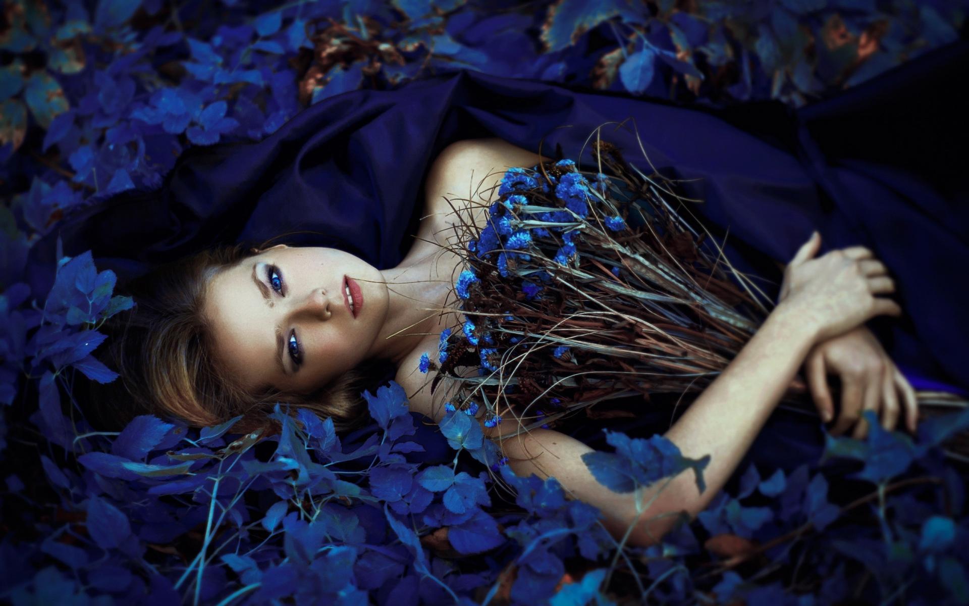 Wallpaper Girl with a bouquet of blue flowers among